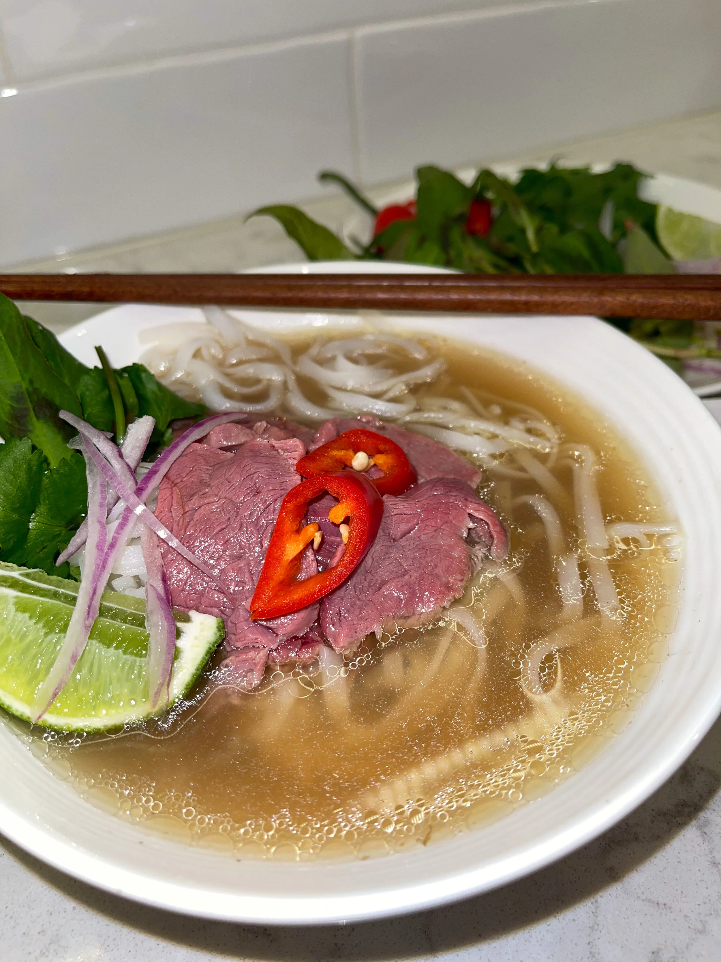 One of my favourite parts about pho is all the sides, the fresh herbs, lime, red onions and sauces make pho so yummy so make sure to include them all!
