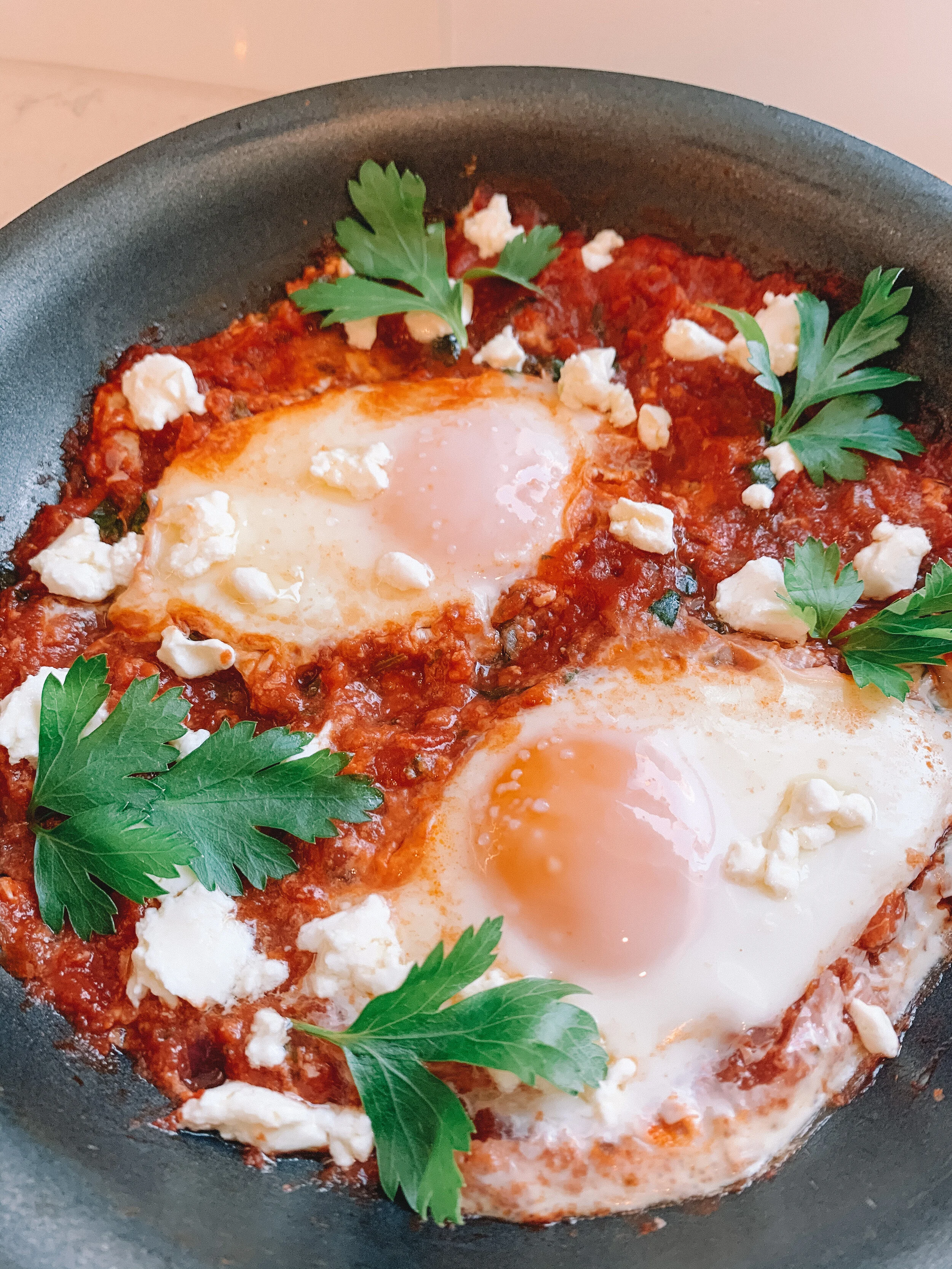 It is the perfect “brunch” recipe and I love to serve with a side of crusty bread to dip into the eggs and sauce and some avocado.